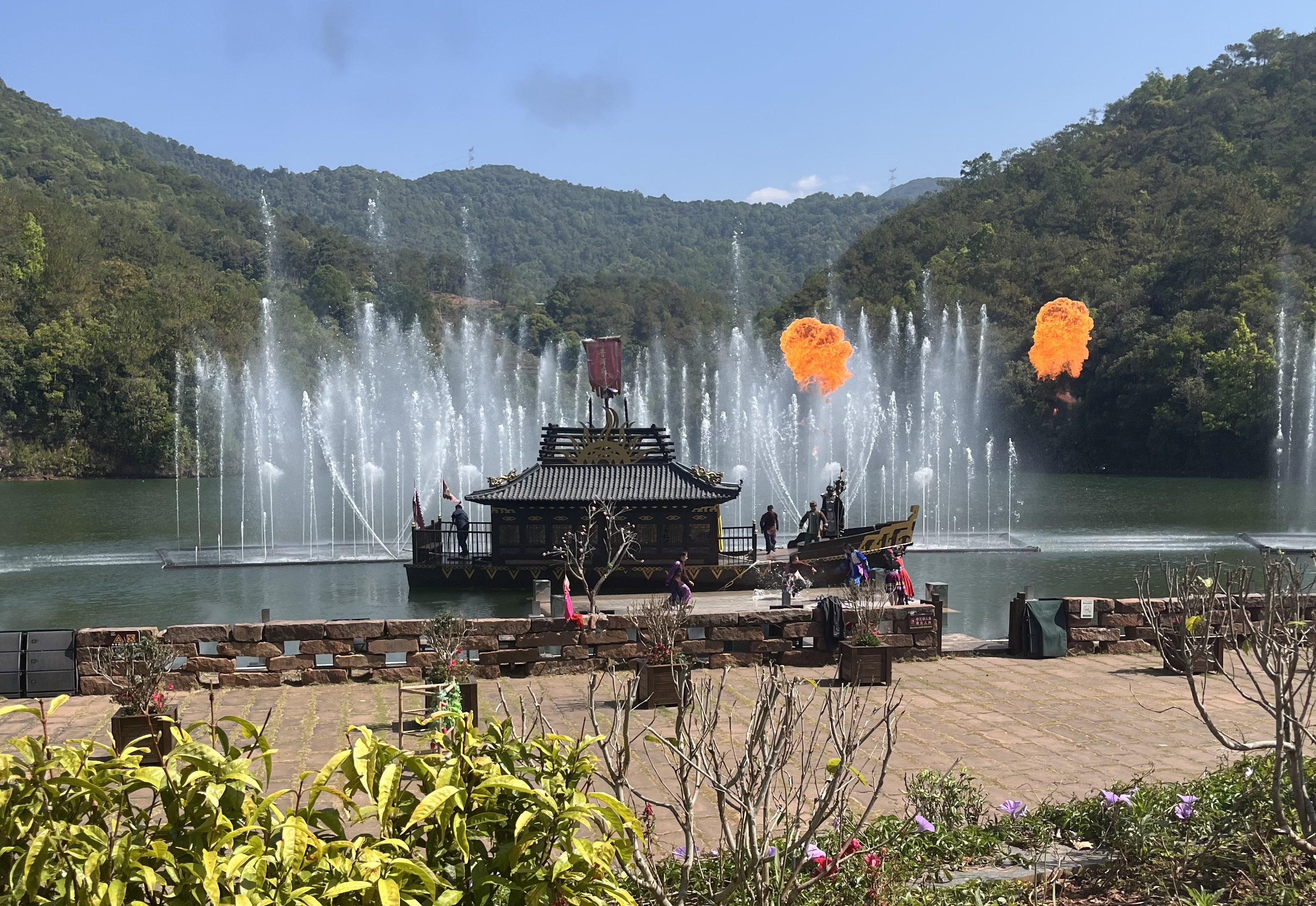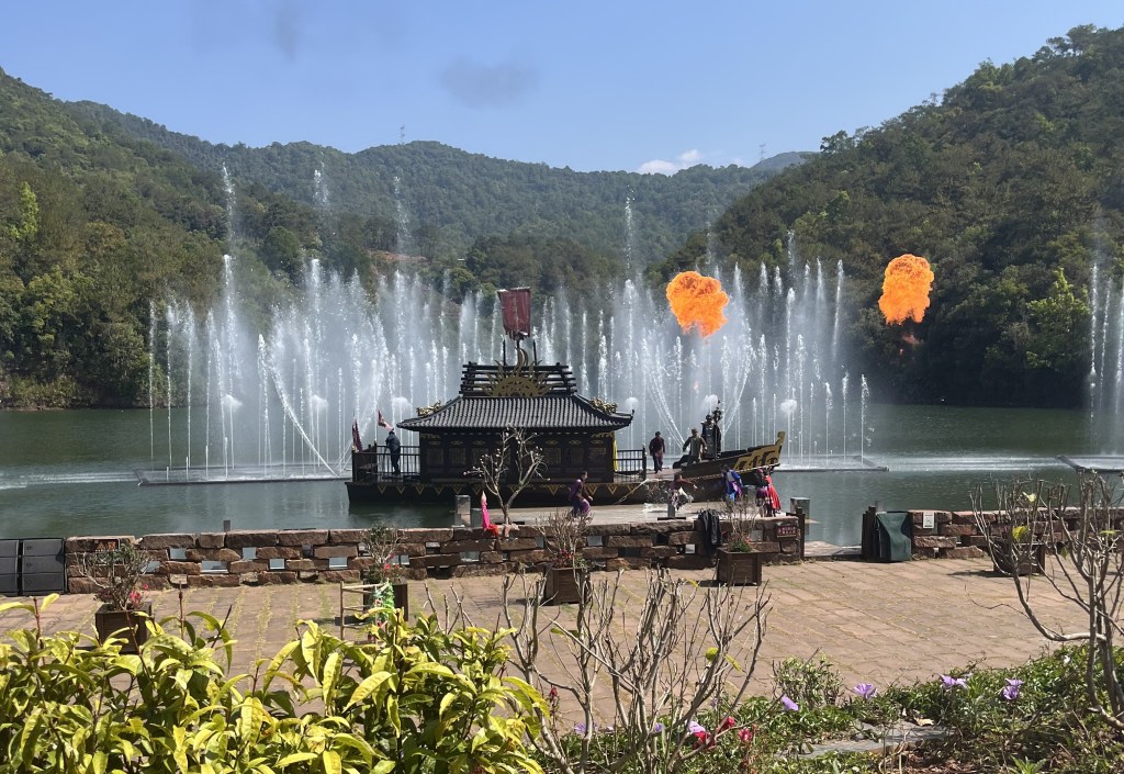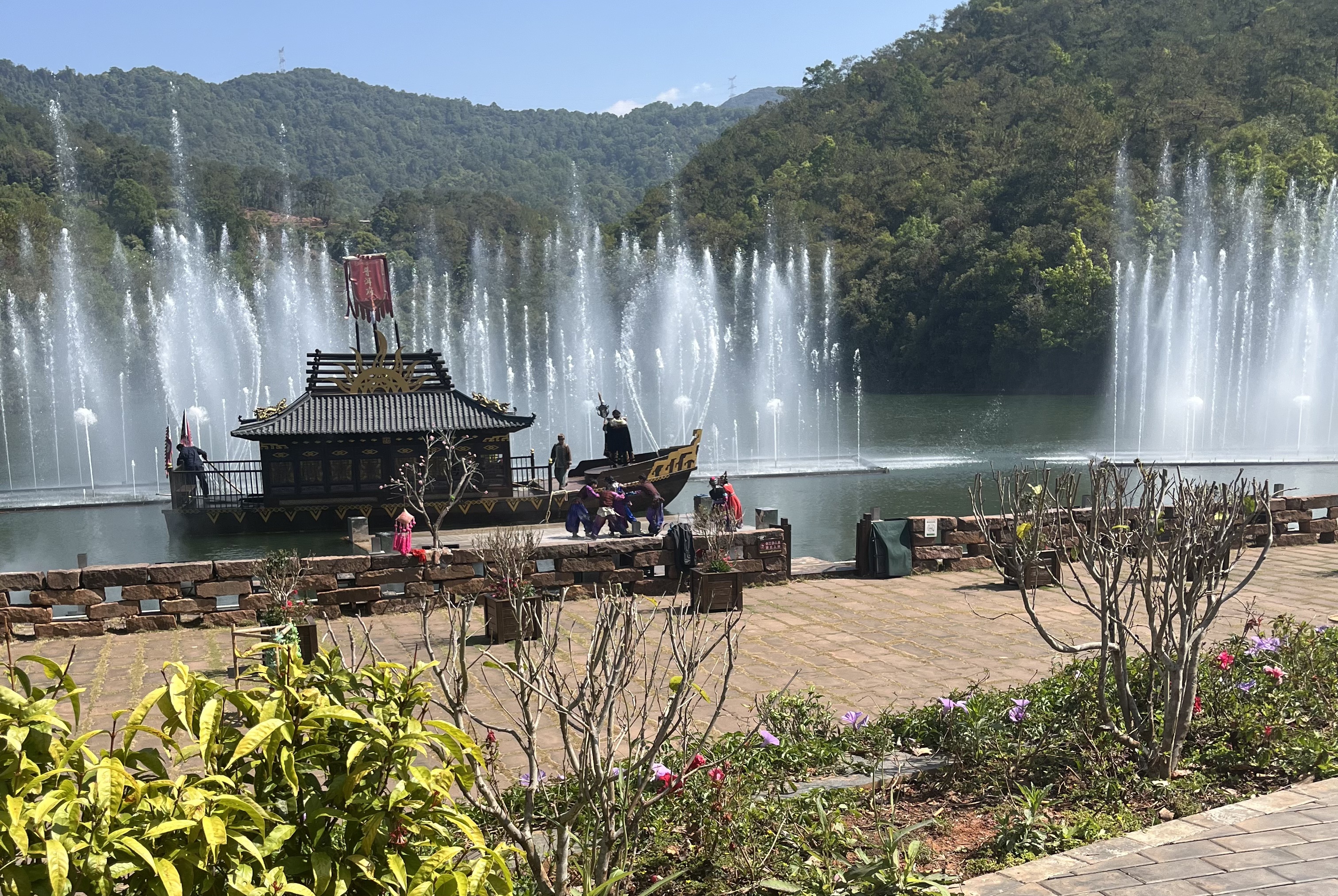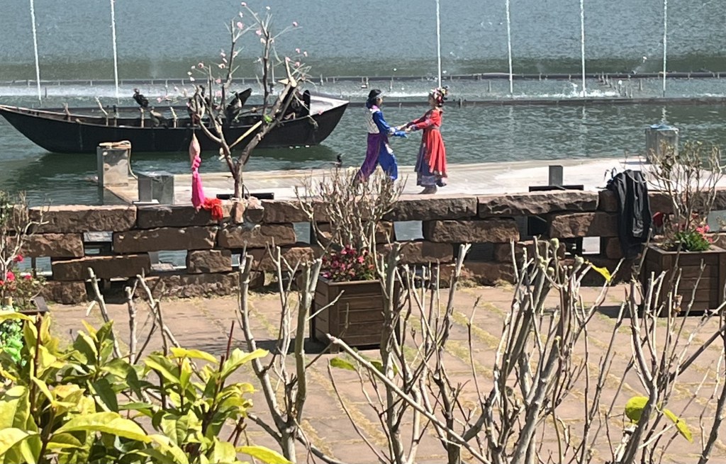 The tea girls bid us a fond farewell. Orange lady has been sidelined and the hero and heroine have disappeared on his boat. The ducks have flwon home and the water jets take a final bow. The audio is switched off and we are now permitted to proceed to the next experience, which unfortunately is at the top of the hill.