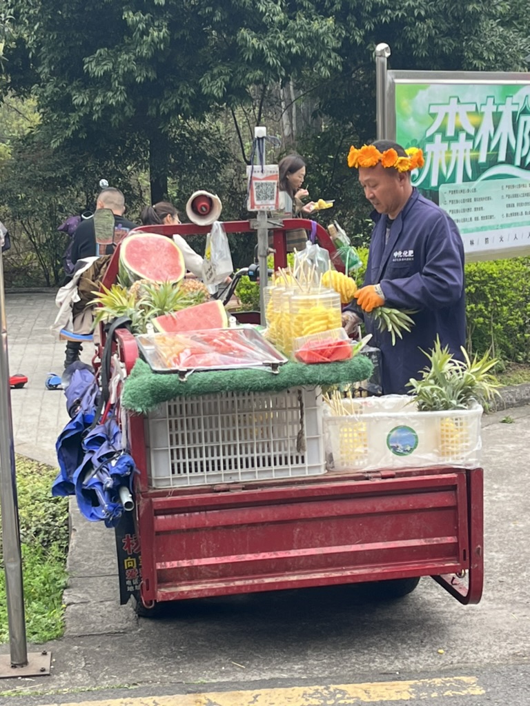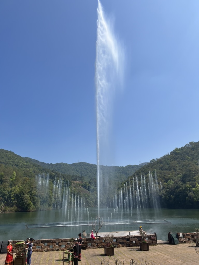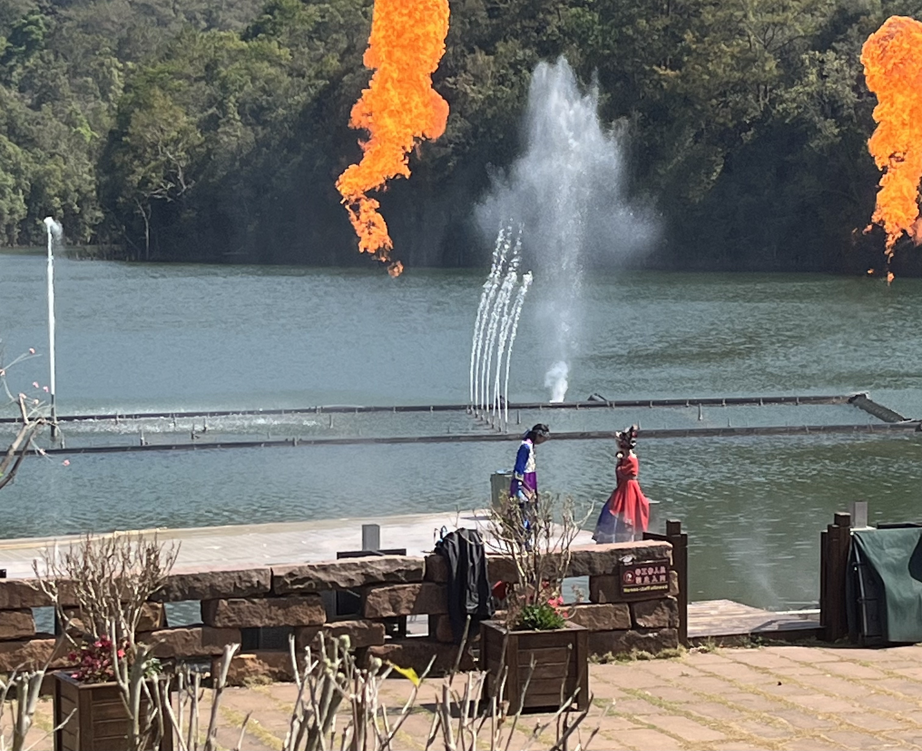 The tea girls bid us a fond farewell. Orange lady has been sidelined and the hero and heroine have disappeared on his boat. The ducks have flwon home and the water jets take a final bow. The audio is switched off and we are now permitted to proceed to the next experience, which unfortunately is at the top of the hill.